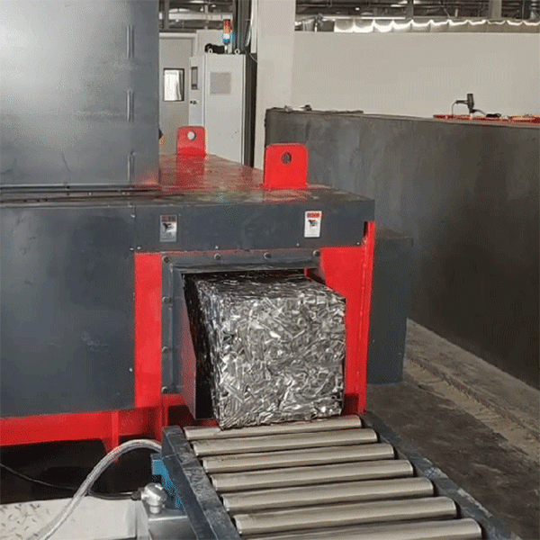 Металлические пакеты автоматически выталкиваются через маленькую дверь с помощью гидравлического цилиндра.