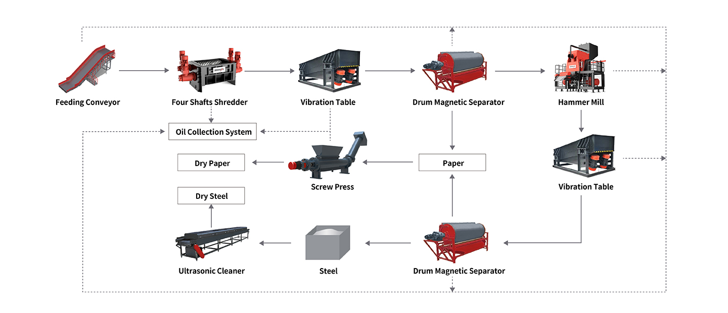 Enerpat® Подержанный раствор для переработки нефтяного фильтра Интегрирует как аппаратное, так и программное обеспечение с модульным дизайном. Производственная линия включает в себя: передачу, дробление, магнитное разделение, удаление пыли и систему управления автоматизацией. Масляные фильтры изначально измельчаются на 60-миллиметровые кусочки с помощью измельчителя с четырьмя валом, с вибрирующим экраном, обеспечивающим равномерное питание при разделении масла. Магнитный сепаратор отделяет железо от бумаги, а железо отходов измельчается молотком, очищается и высушивается для производства чистого железа, в то время как пропитанная масляной бумагой бумага снята, чтобы дать сухую бумагу.